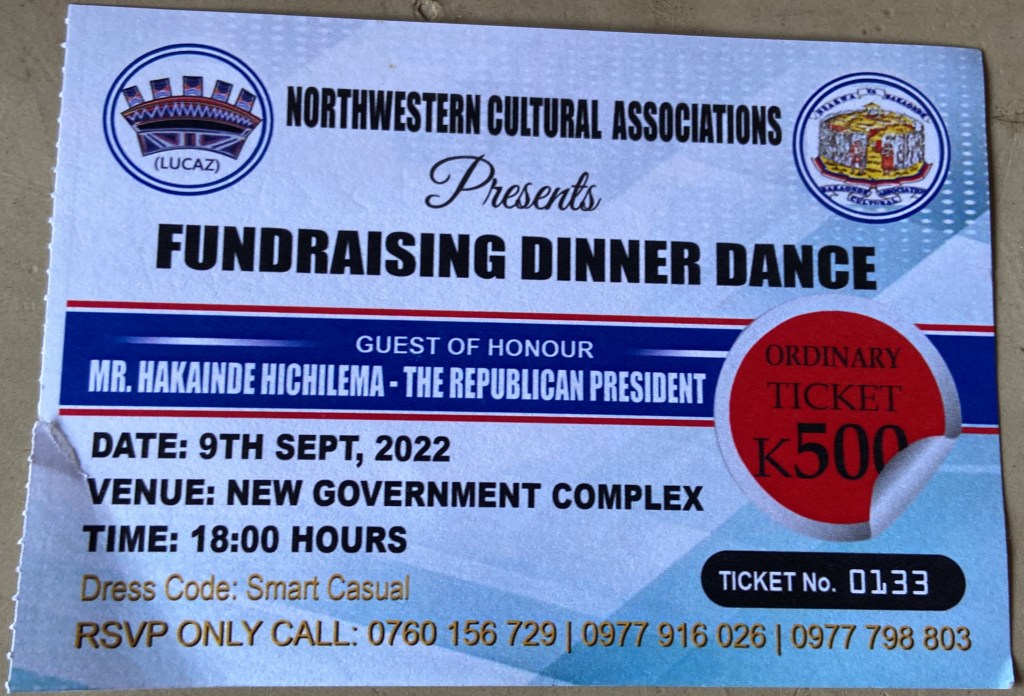 An meinem letzten Abend in Lusaka war ich zu einem Fundraising Dinner Dance im New Government Complex eingeladen. Gemäss Einladung sollte seine Exzellenz, Präsident Hakainde Hichilema, der Ehrengast sein.